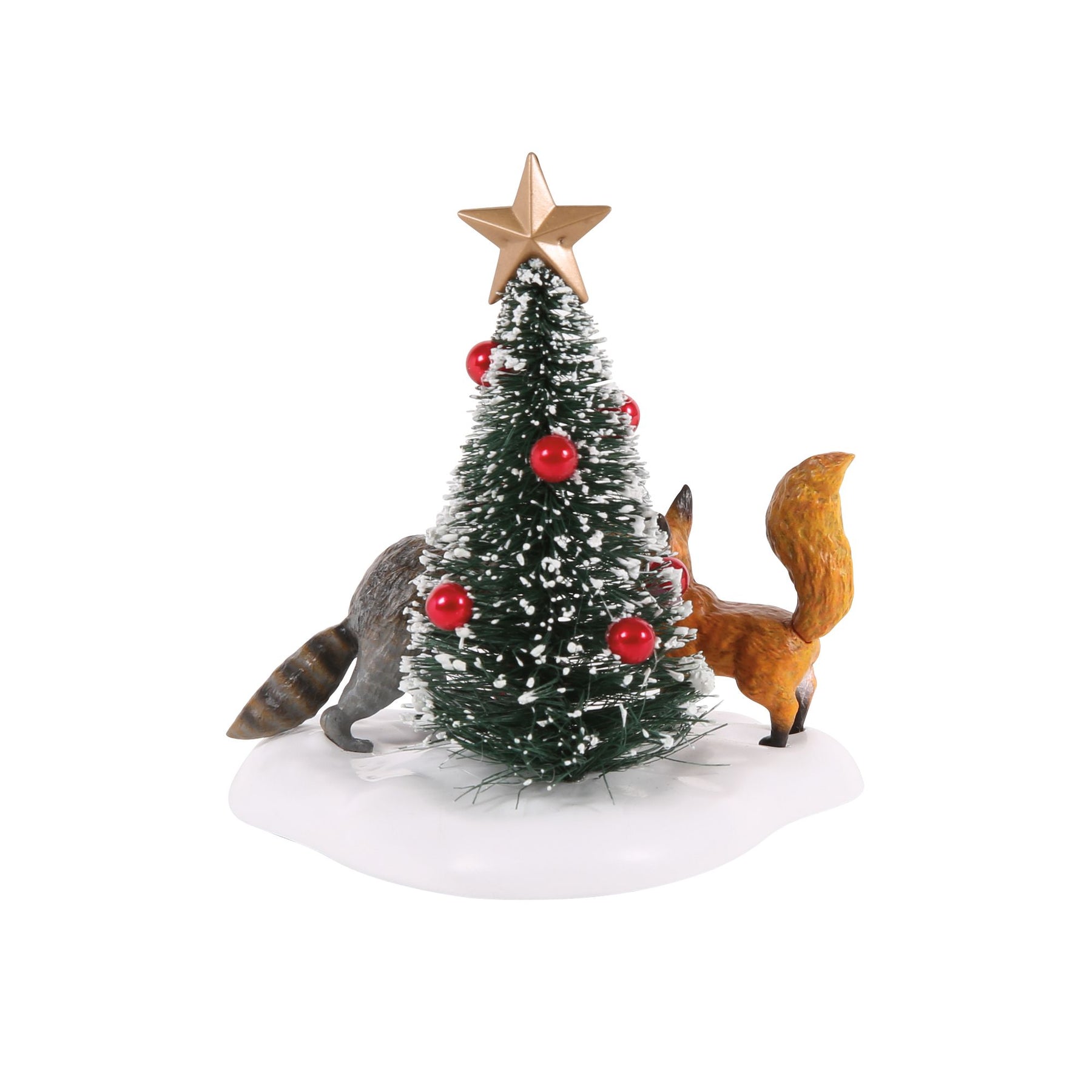Two woodland friends, one joyful tree - the raccoon and fox take turns spreading Christmas spirit with every red ornament they hang.